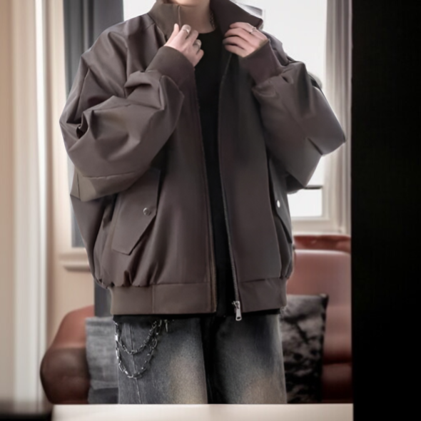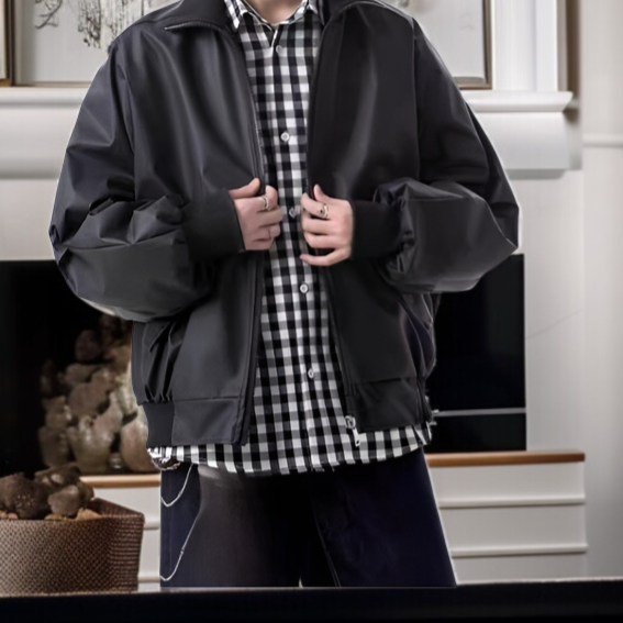 ● ゆったりとしたシルエットとスタンドカラーが、動きやすさと高級感を両立。ベースボールジャケット風のカジュアルさも魅力。